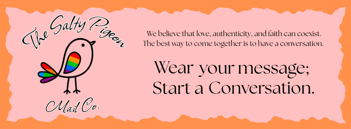 Vicki is selling LGBTQ friendly t-shirts, along with stickers, mugs, etc, that have a message and can help you begin important conversations. You might want to buy some of her merch at this link: The Salty Pigeon Gift Co. Everything goes for a good cause!